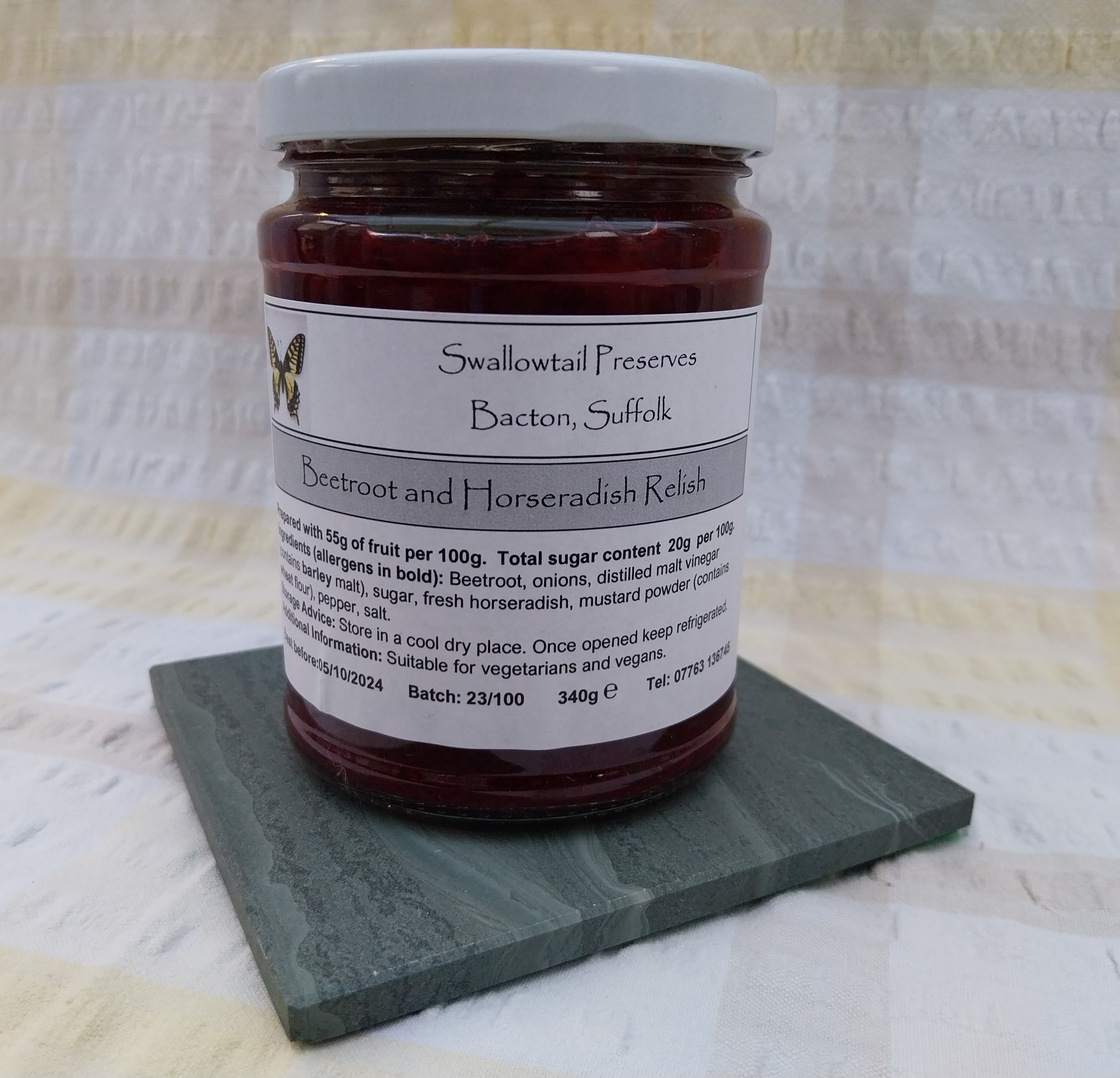 ![]() | Our Beetroot and Horseradish relish is made in the autumn and through the winter, depending on the availability of ingredients. Try it with oily fish such as herring or salmon. |